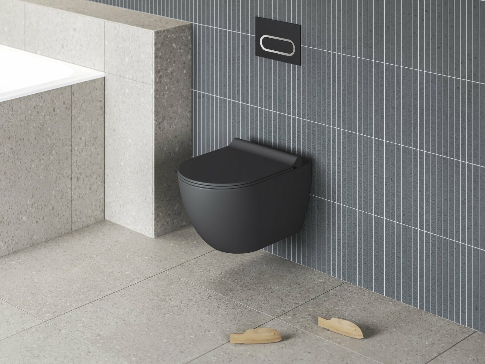 K WC doporučujeme dokoupit instalační splachovací modul, černé ovládací tlačítko Chrome a černé sedátko vybavené zpomalovacím systémem SoftClose - černé WC sedátko Uni Chrome Flat.