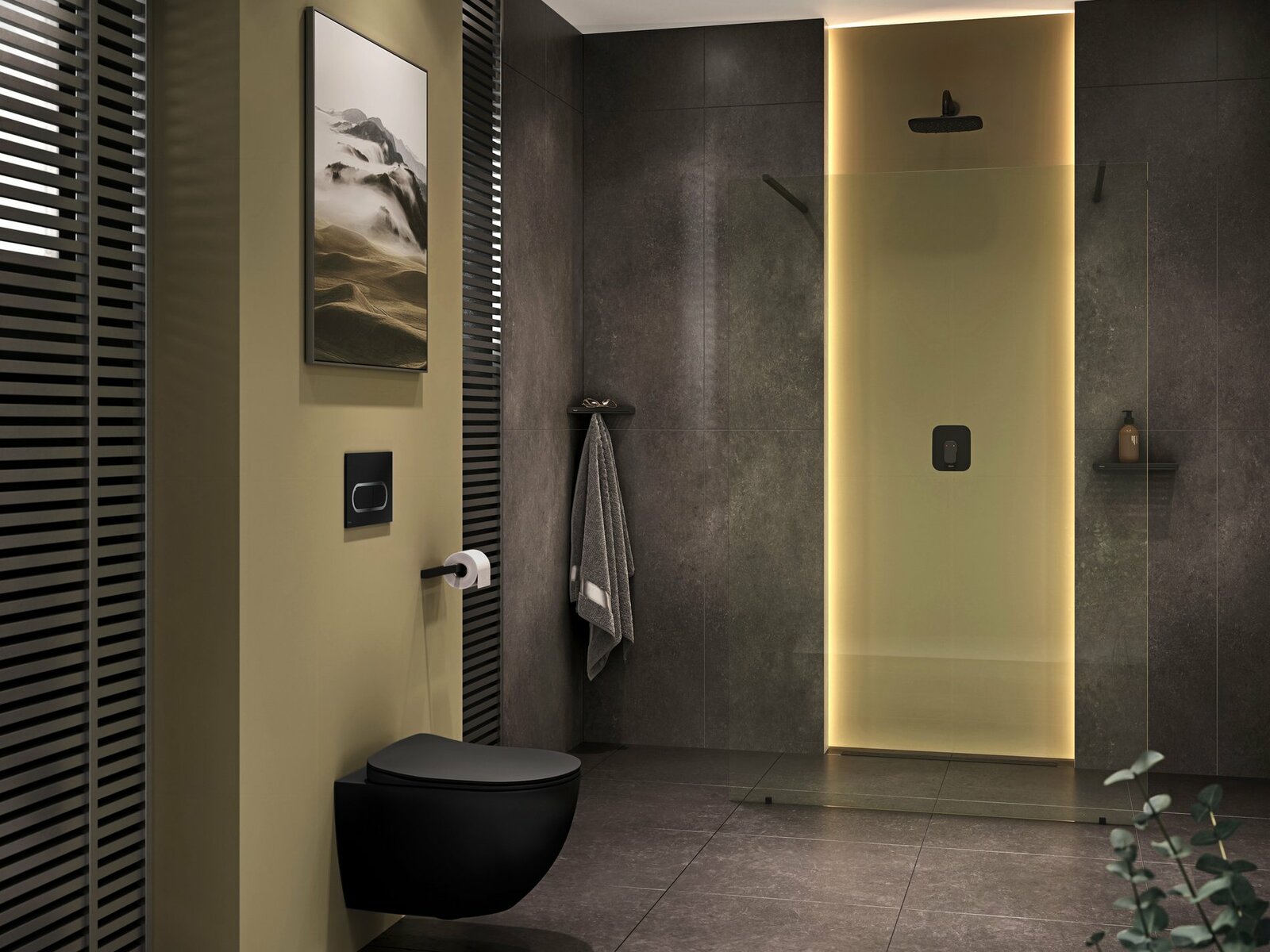 - doplňky k dokoupení: černé WC sedátko Uni Chrome Flat, černé ovládací tlačítko Chrome,instalační splachovací moduly