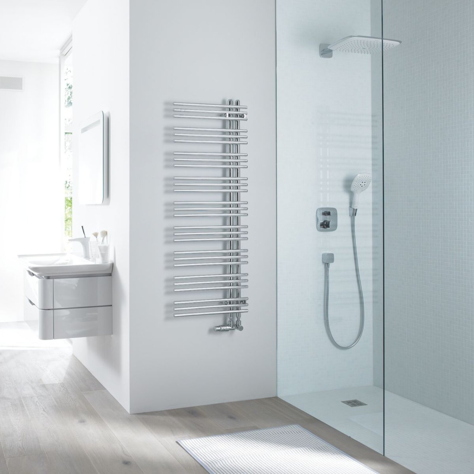 Výjimečně elegantní a praktický design v nejvyšší kvalitě. Oživí prostředí každé koupelny. Umožňuje pohodlné zavěšení ručníků ze strany. Patentovaná konstrukce zaručuje průtok topného média ve všech vodorovných trubkách a díky tomu vytápění v celém radiátoru.