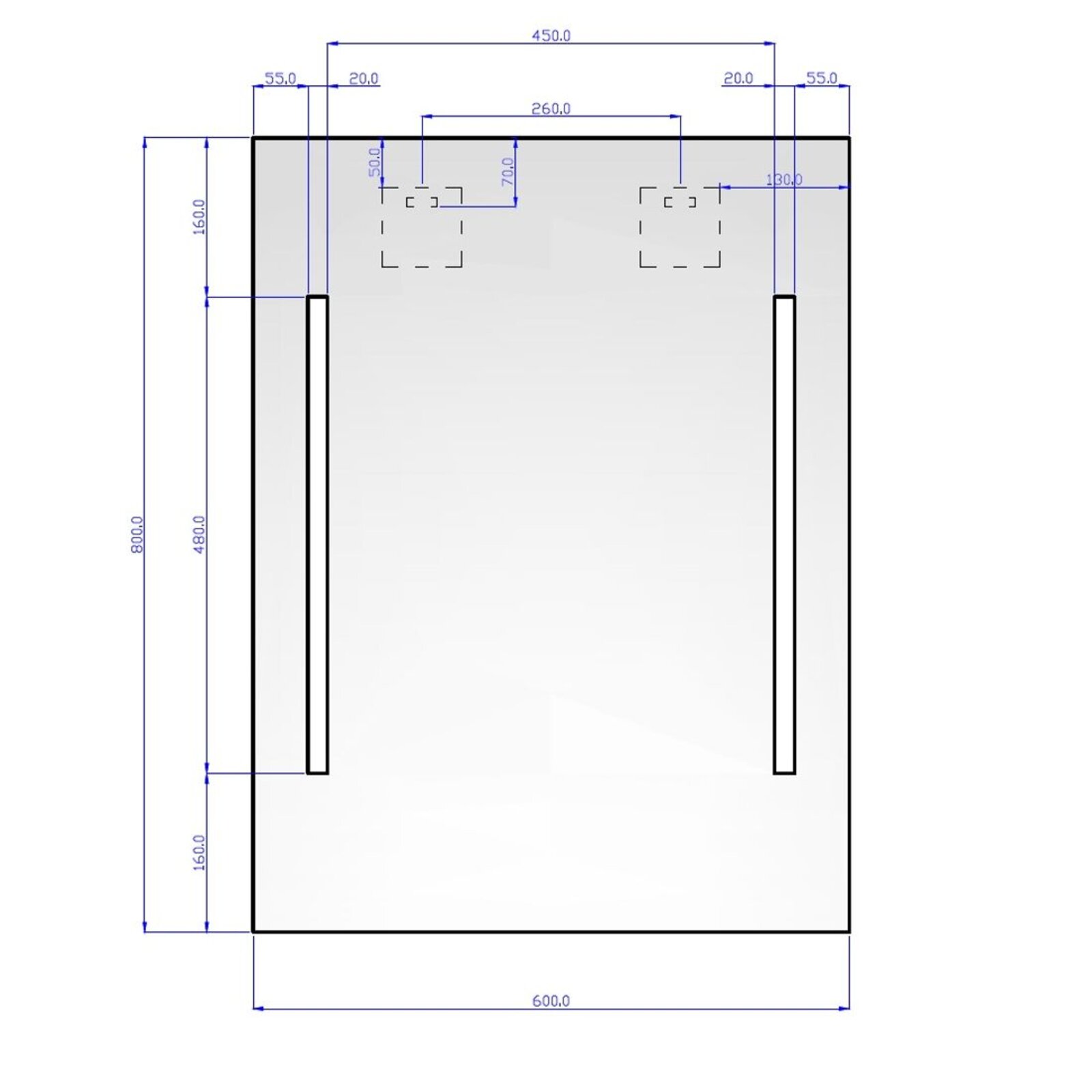 Zrcadlo do koupelny v rozměrech 60x80 cm s osvětlením a vypínačem v dolní části zrcadla.