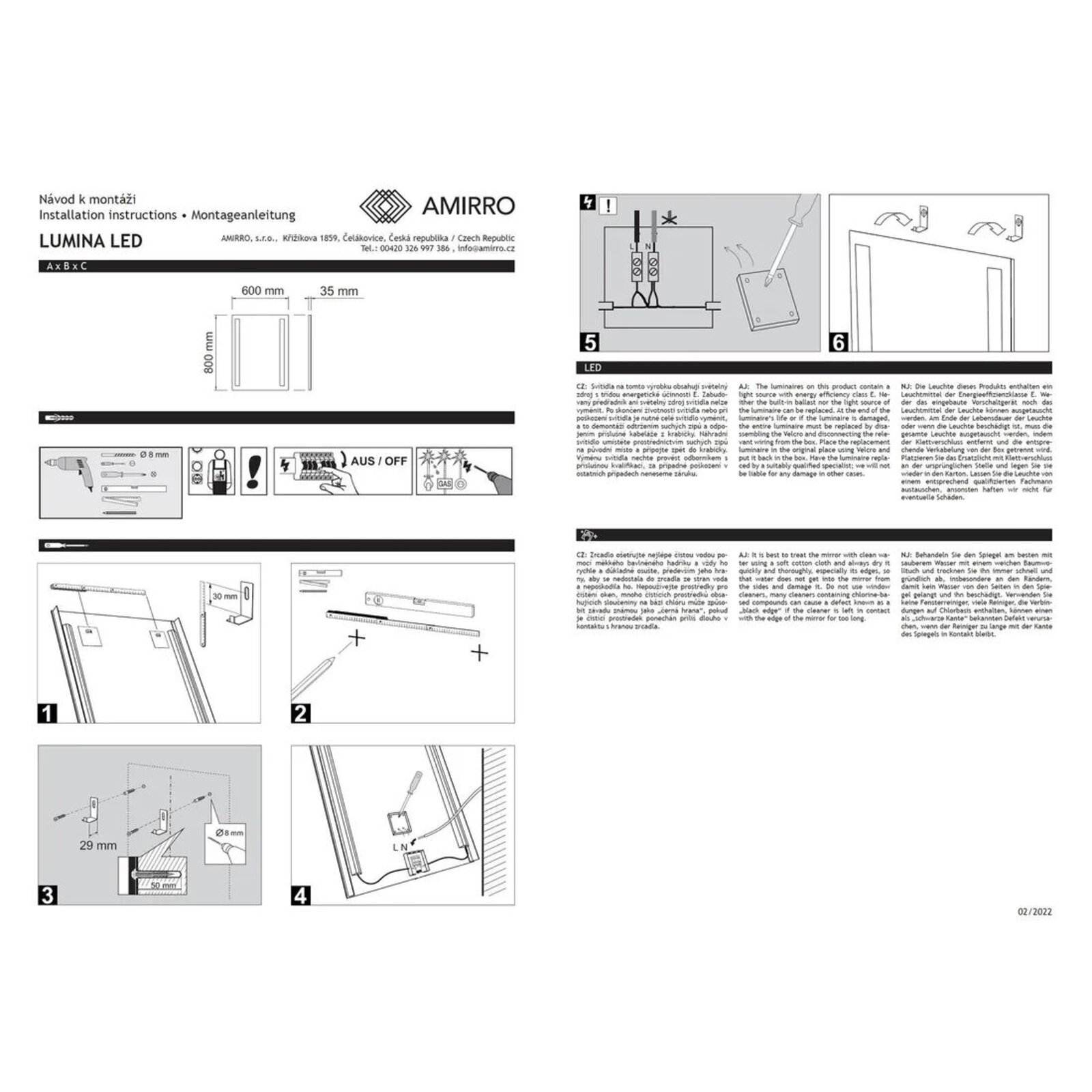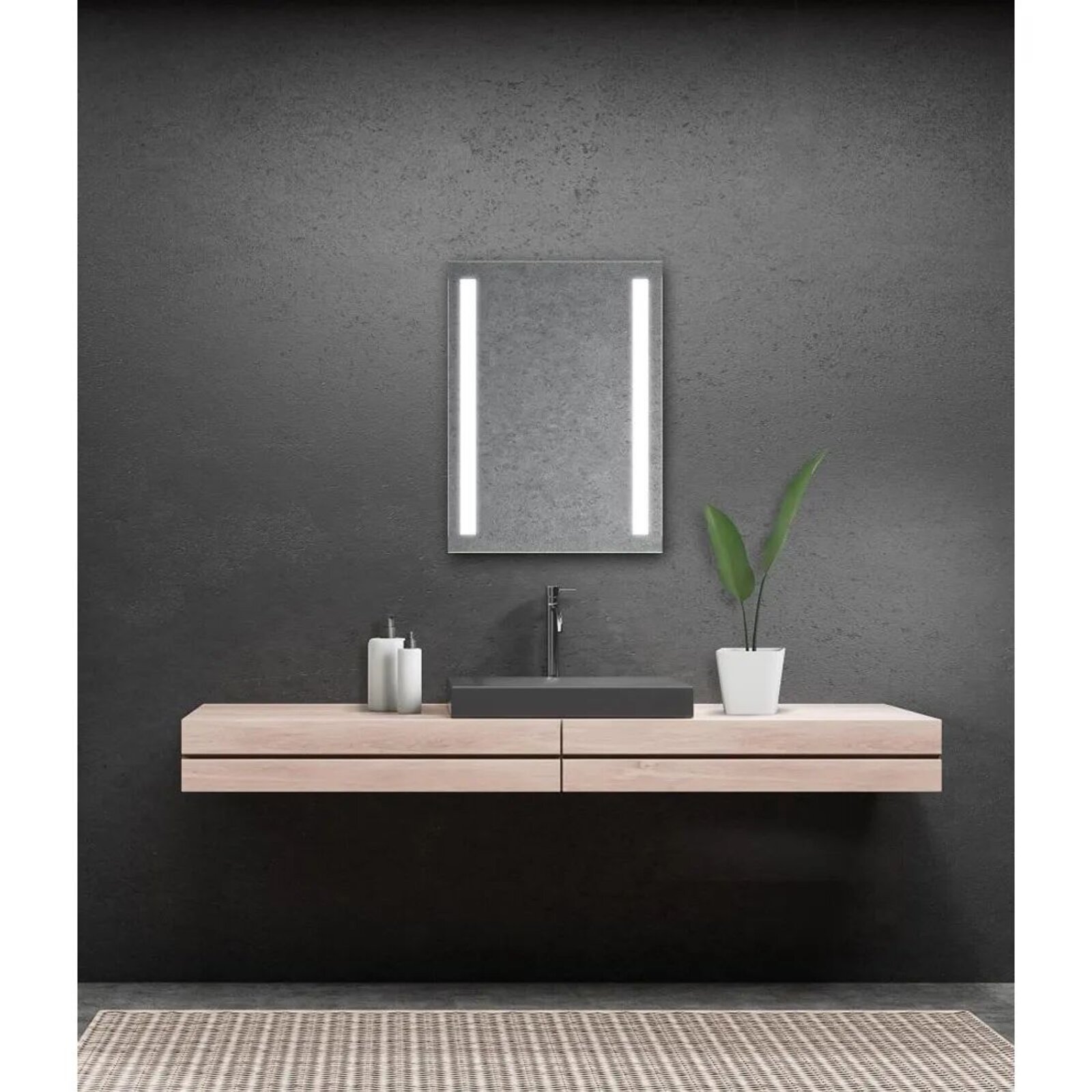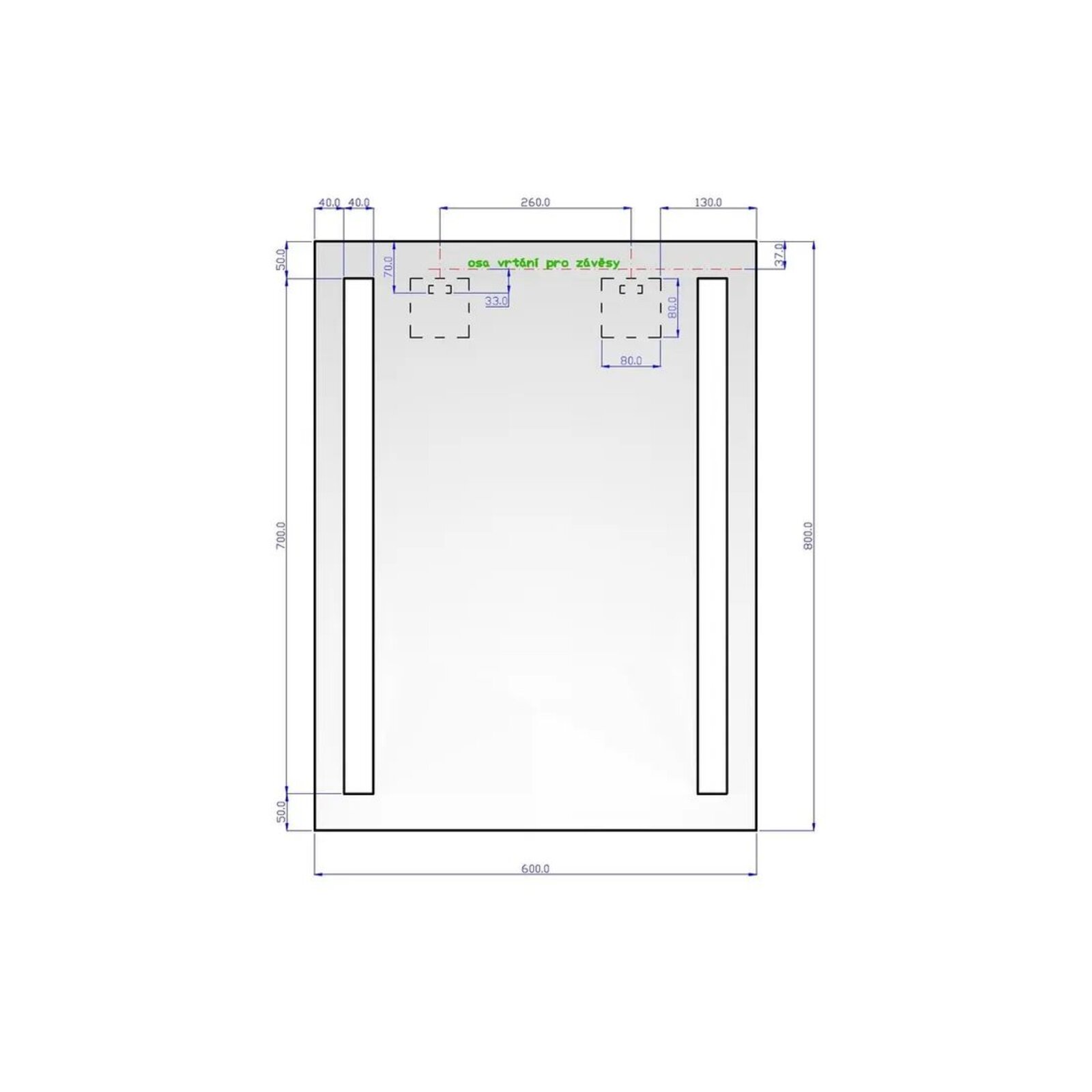 Tloušťka zrcadla včetně podsvícení je cca 4 cm, podsvícené pruhy mají rozměr 60 x 4 cm, vybaveno úchyty (závěsy i vhodné háky na zeď) pro svislé zavěšení. Zrcadlo je v provedení bez vypínače tj. rozsvěcí se příslušným vypínačem na zdi.